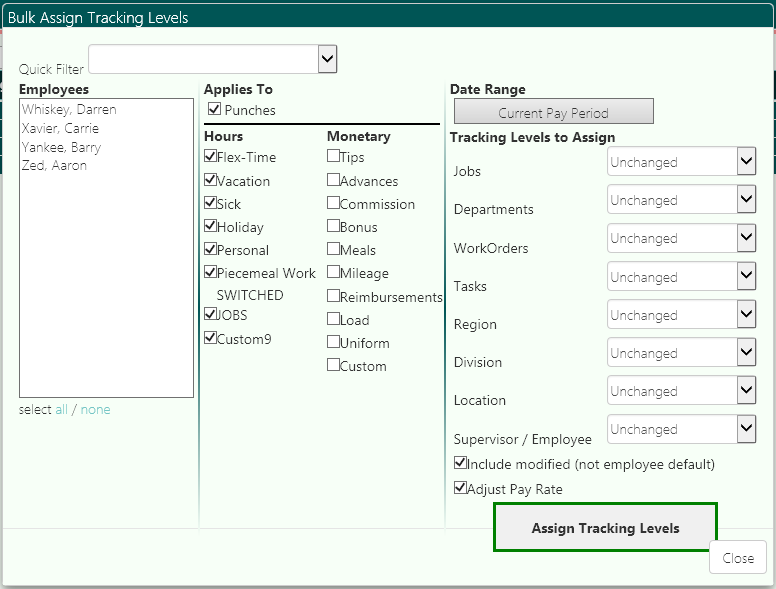Select the employees whose entries you want to change, by using the quick filter, or by selecting employees individually. You can hold down the SHIFT key to select a range of employees, or hold CTRL to select one-by-one. You can also use your Quick Filter to select employees by their group affiliation (e.g., Department, Location, etc.).